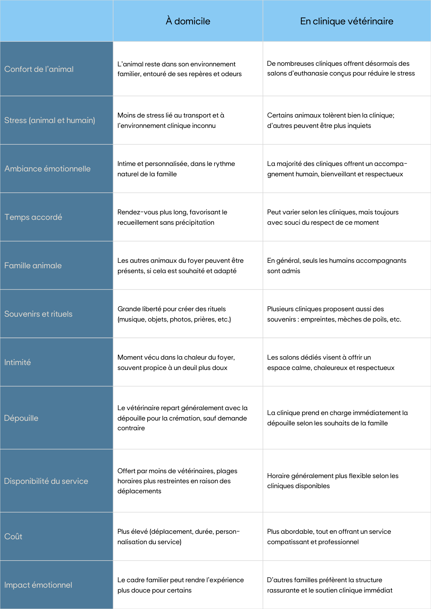 À domicile, l’animal bénéficie d’un environnement familier et d’un moment plus intime, tandis que la clinique offre un cadre structuré, rassurant et souvent très bien aménagé pour ce type de situation.
